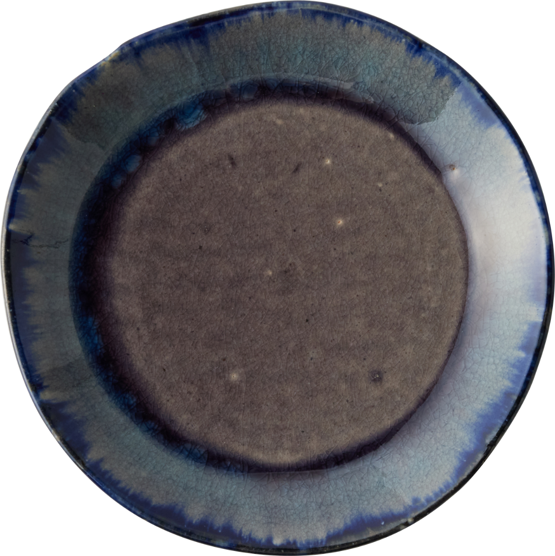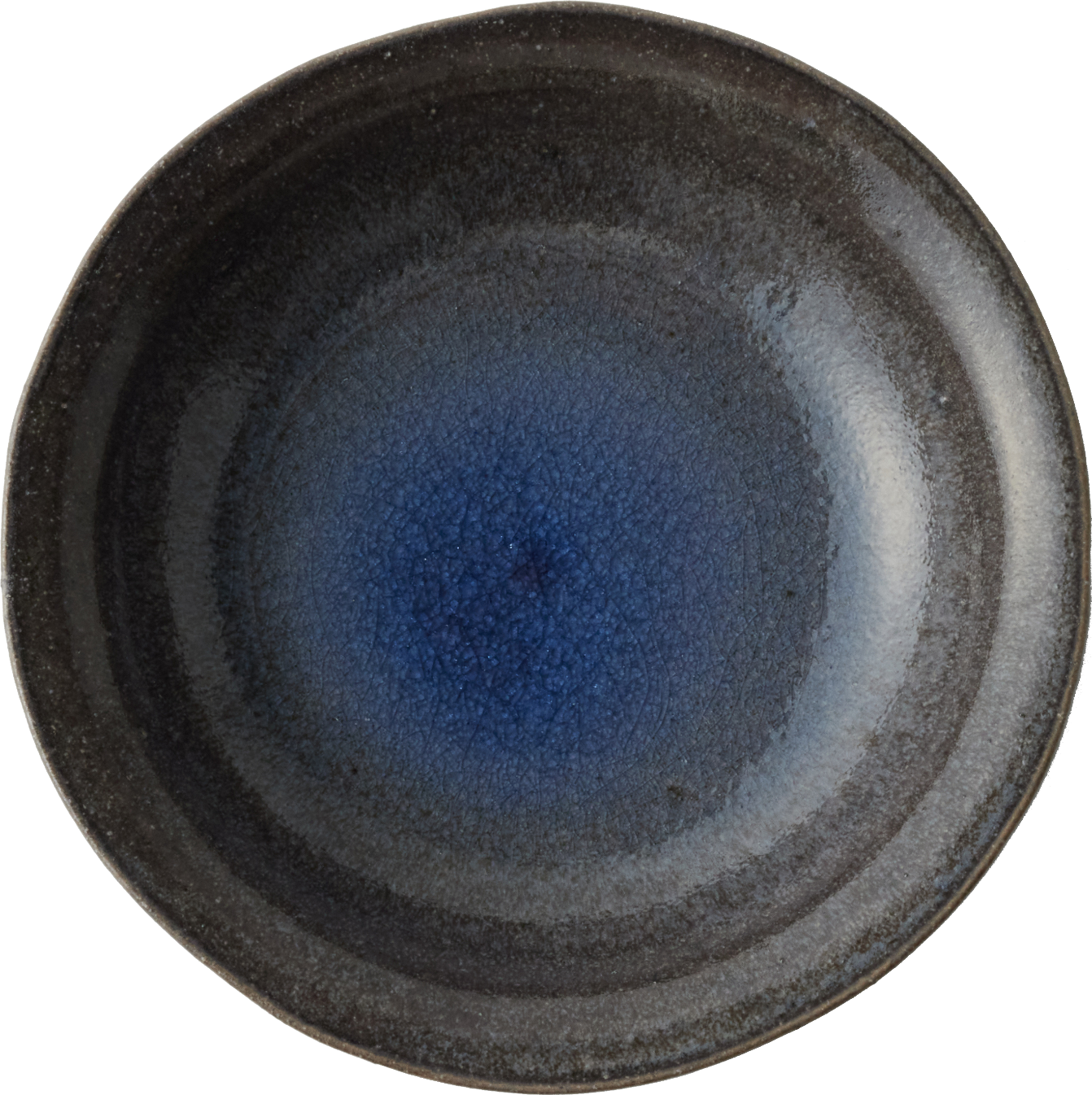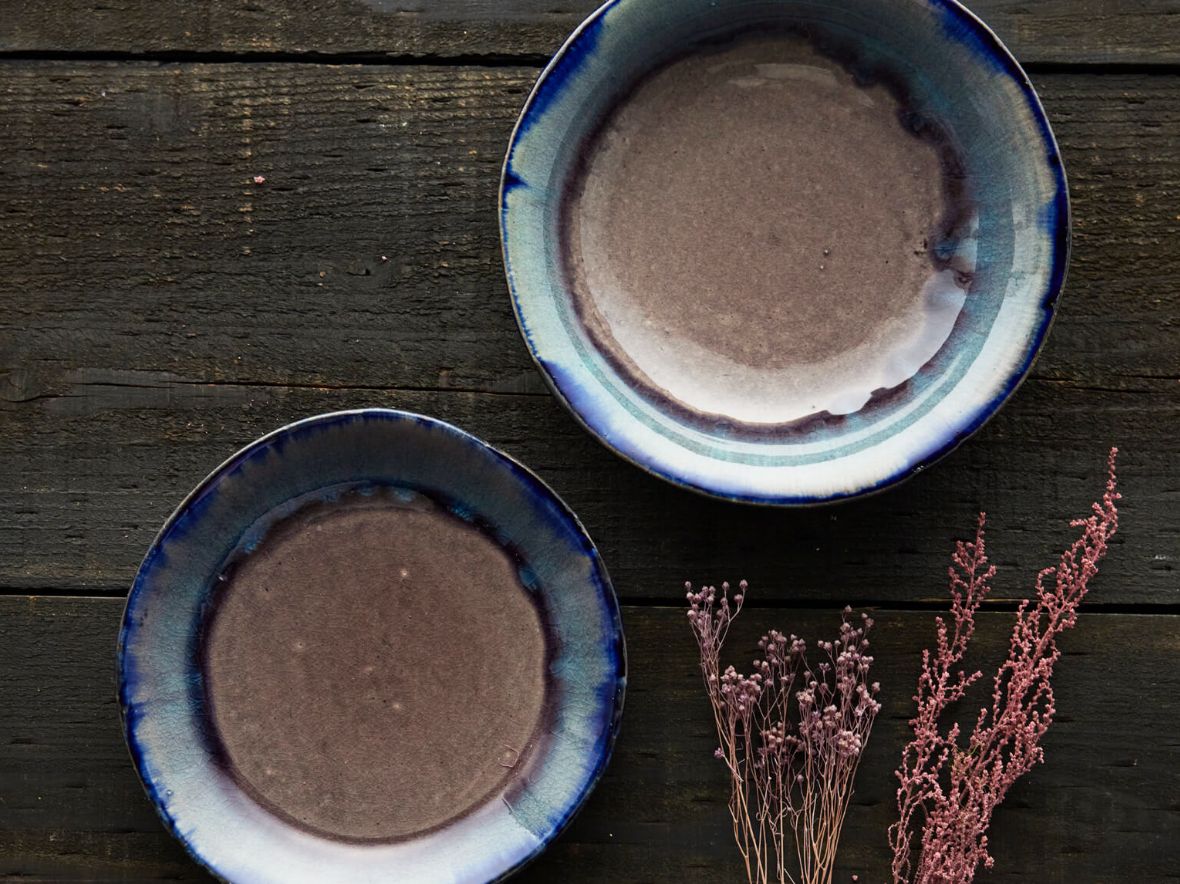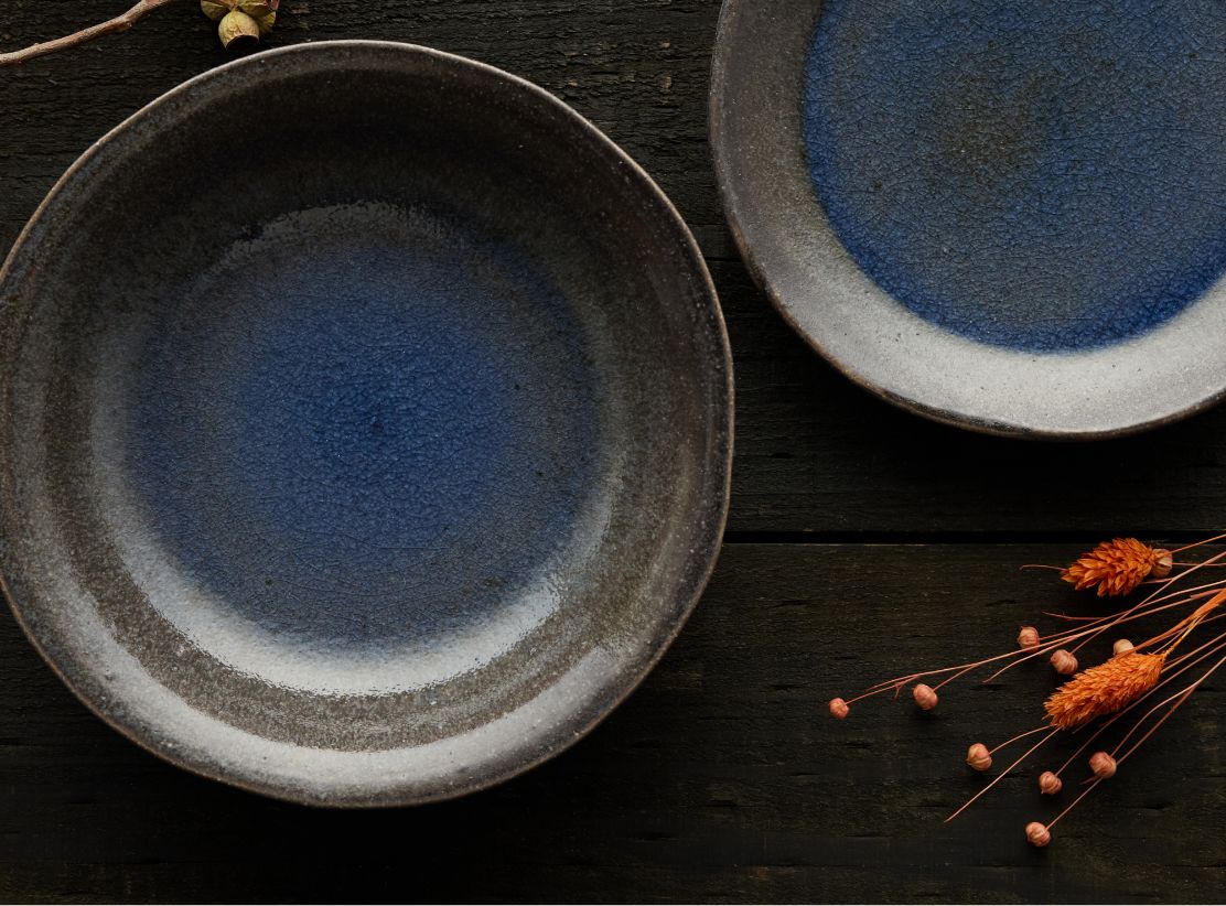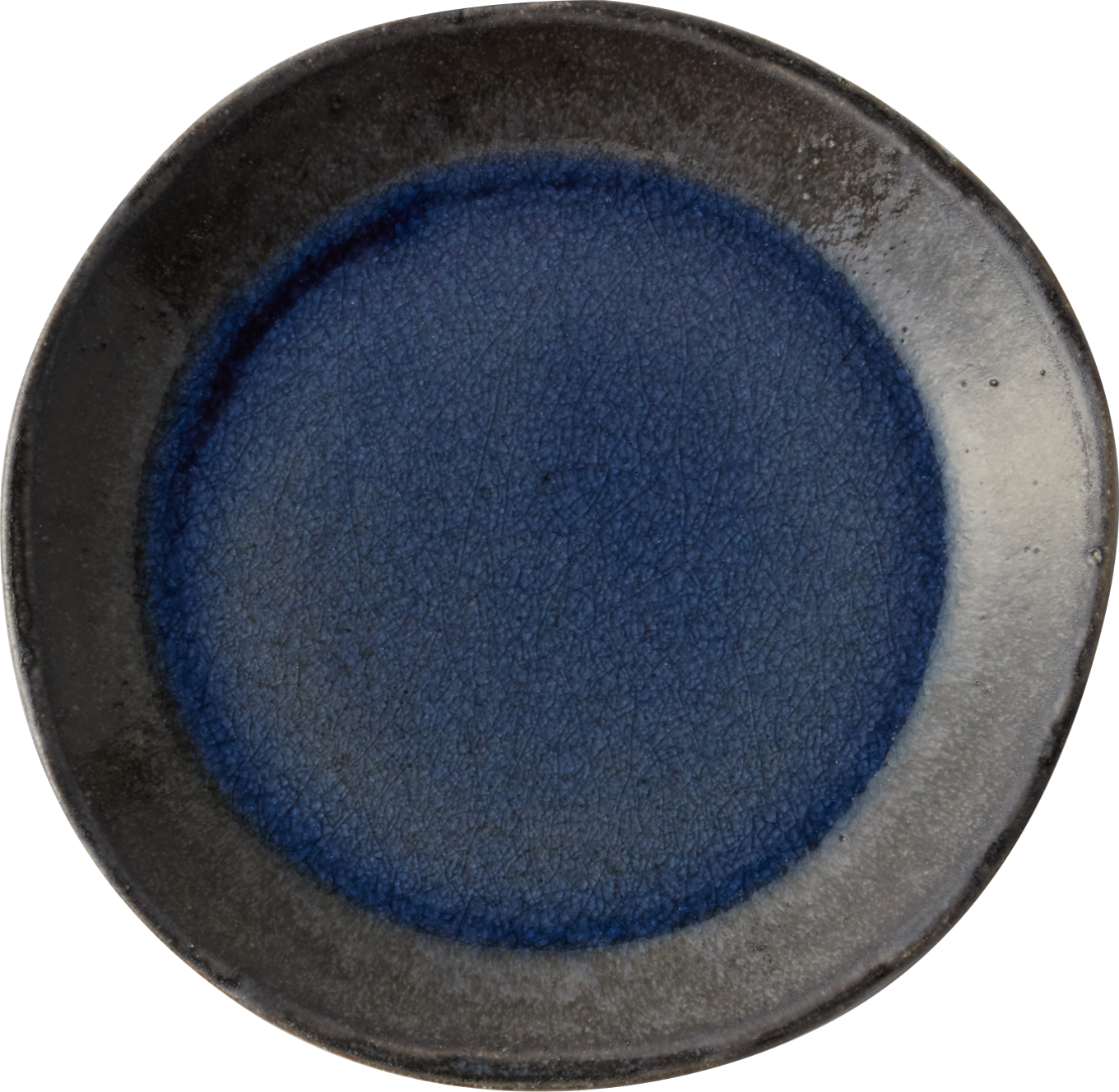 クラフト感を際立てるため、全体のシルエットやエッジの立ち方も、あえて少し歪ませて成形。ベースとなる瑠璃色のガラス系釉薬を内側と外側に掛け分け、複数の顔料を溶け合わせることで、自然なグラデーションを表現した世界にひとつだけの個性溢れる風合いに。