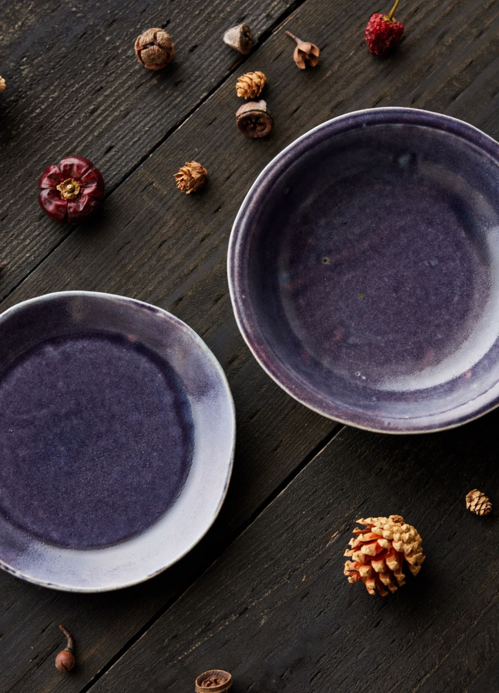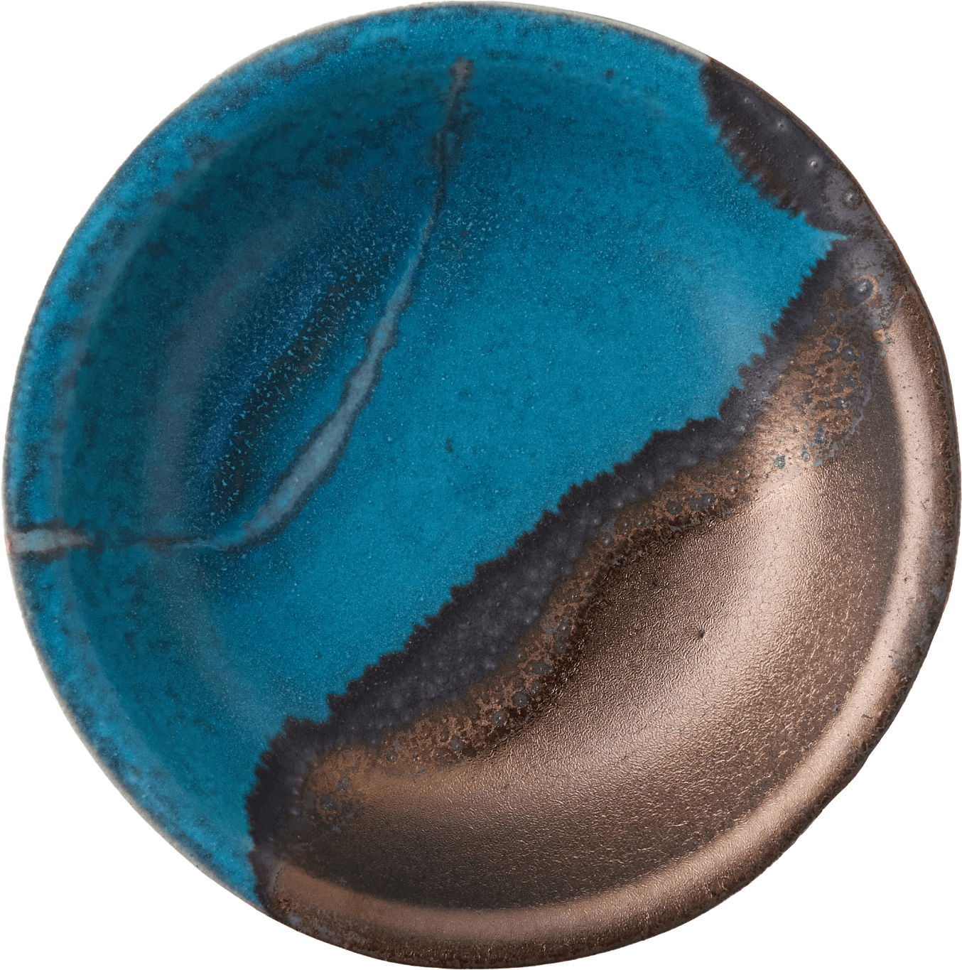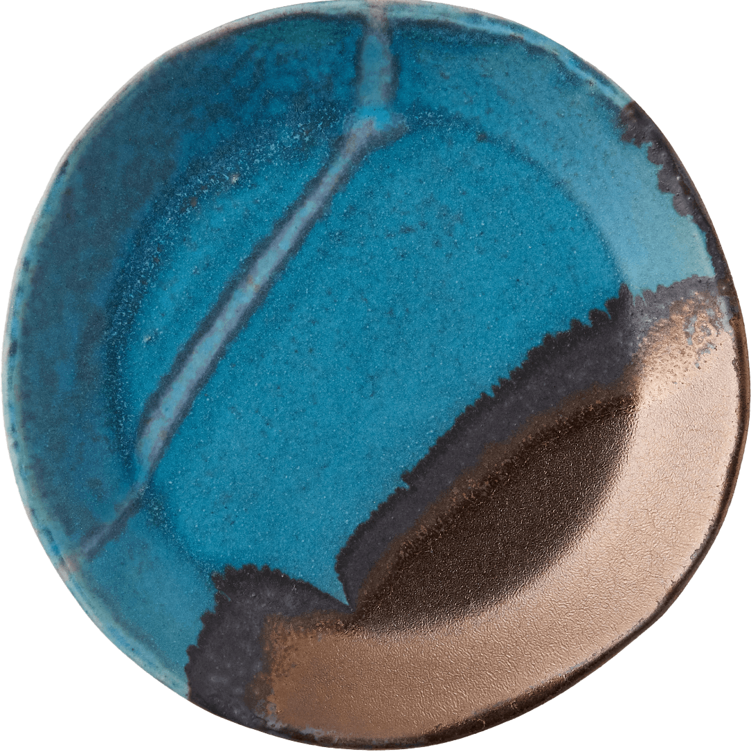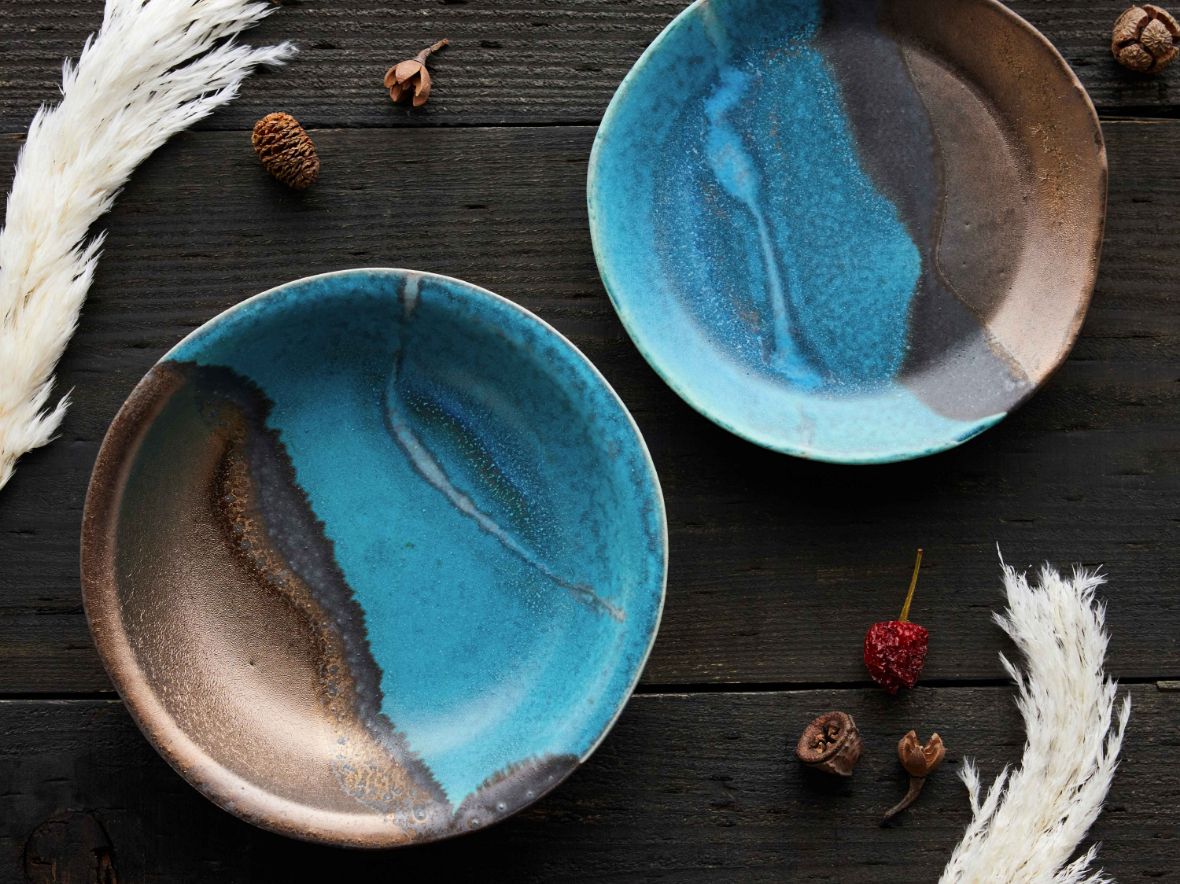 クラフト感を際立てるため、全体のシルエットやエッジの立ち方も、あえて少し歪ませて成形。ベースとなる瑠璃色のガラス系釉薬を内側と外側に掛け分け、複数の顔料を溶け合わせることで、自然なグラデーションを表現した世界にひとつだけの個性溢れる風合いに。