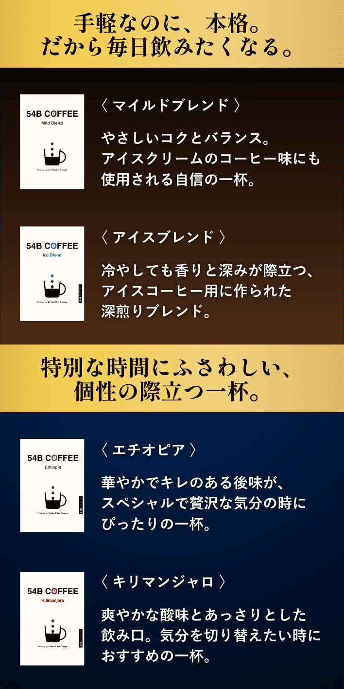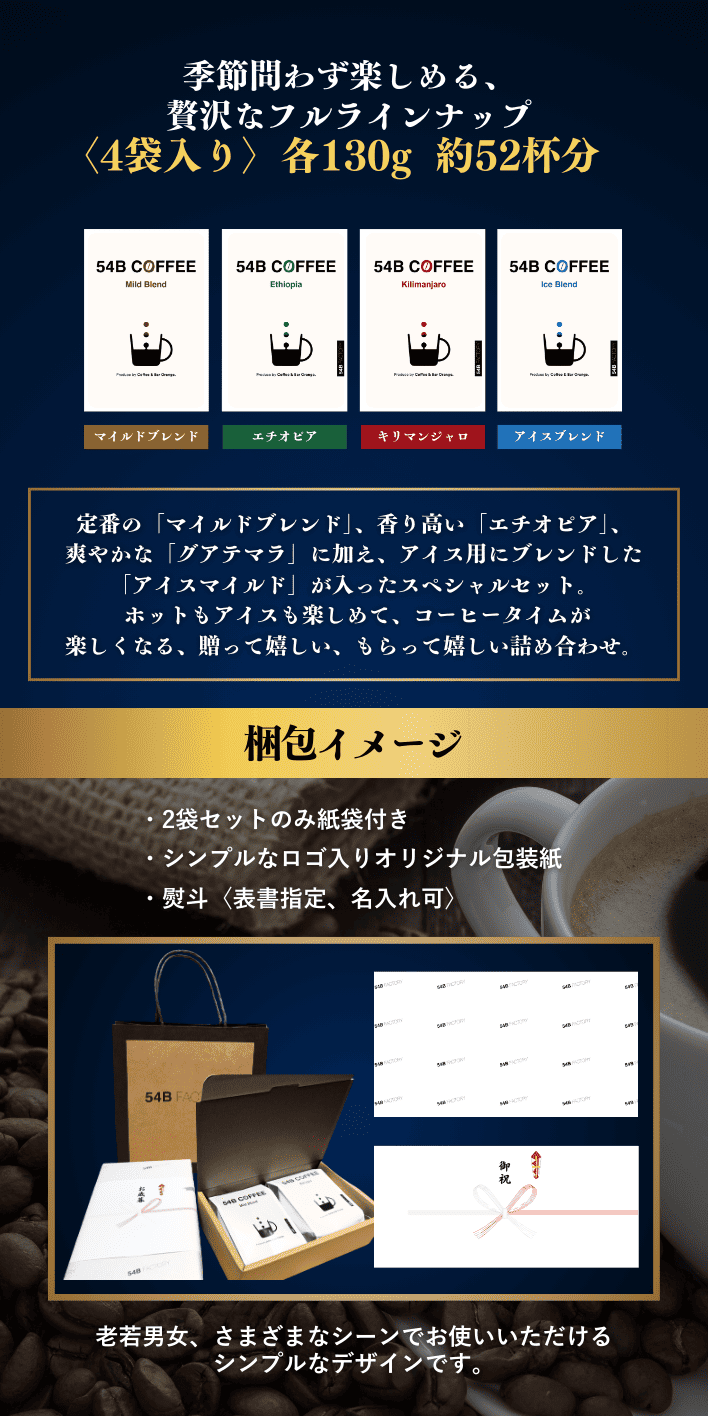 | 内容量(4袋入り) | マイルドブレンド130g、アイスブレンド130g、エチオピア130g、キリマンジャロ130g |