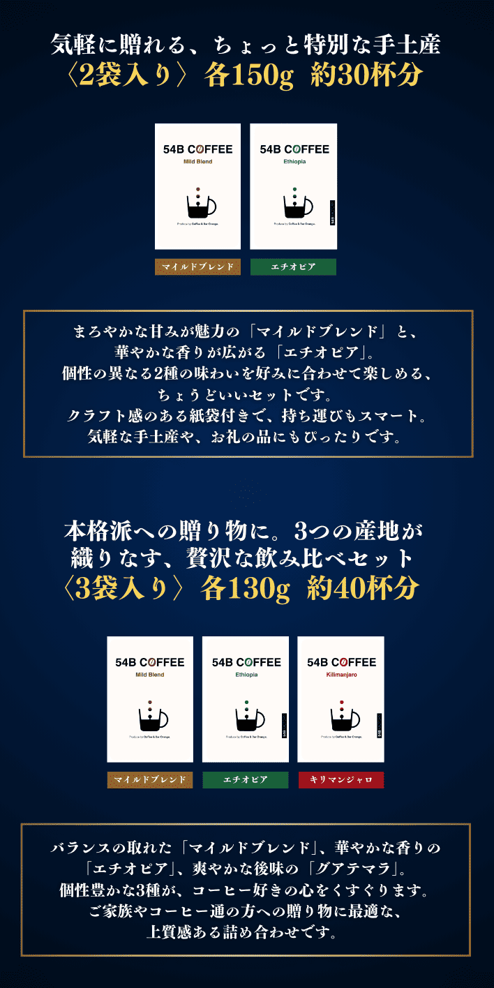 | 内容量(2袋入り) | マイルドブレンド150g、エチオピア150g |