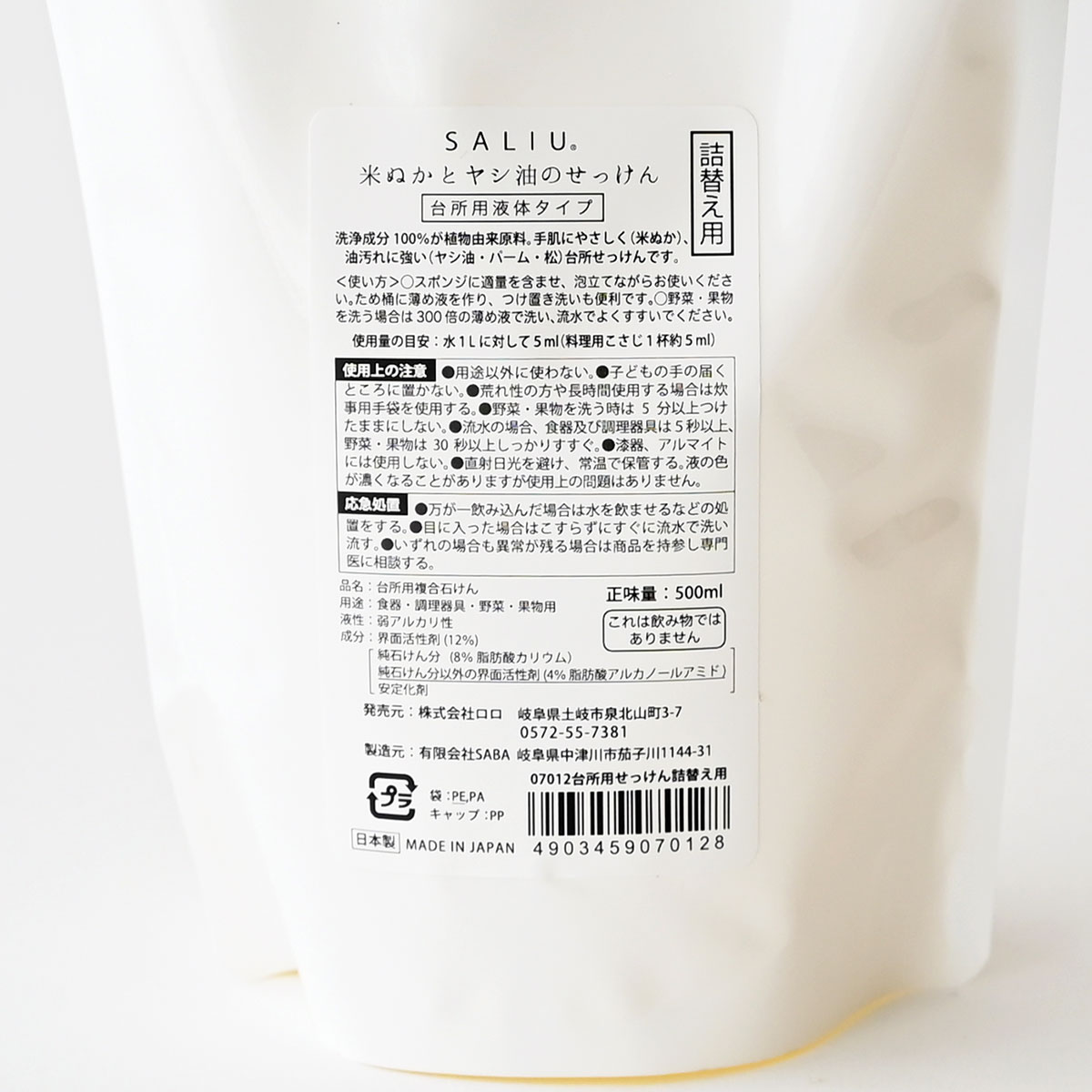 | 商品名 | 【SALIU】米ぬかとヤシ油のせっけん 台所用 500ml 詰め替え |