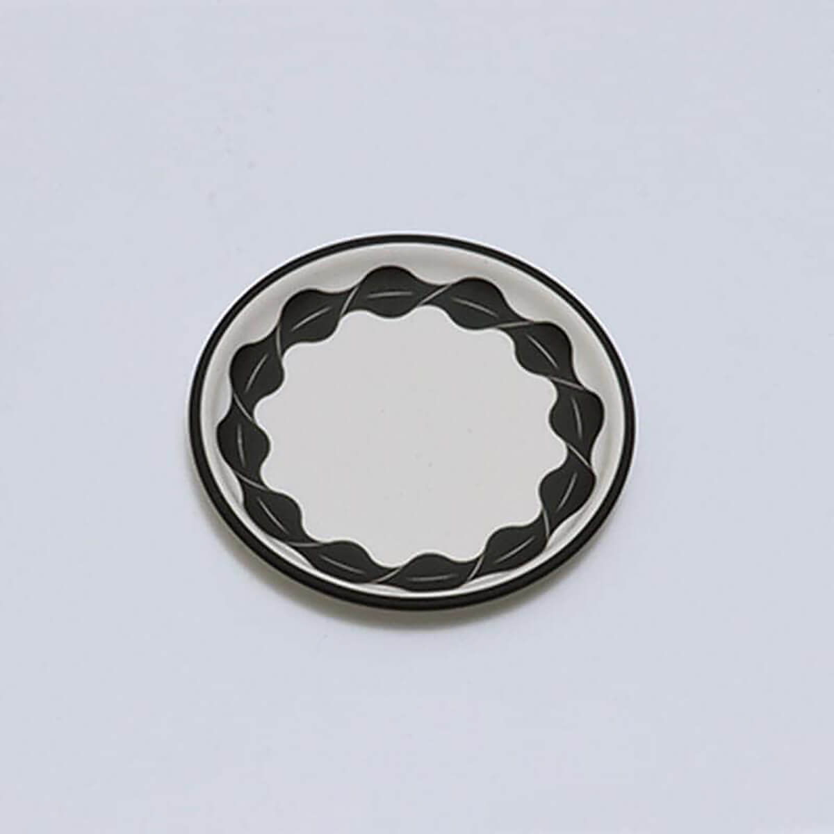柄部分は黒い絵の具と撥水剤を混ぜて印刷しているため、施釉(釉薬をかける工程)の際に柄の上には釉薬がかかりません。その結果、柄はマットな黒の質感のまま、余白の白部分のみ釉薬で艶やかに仕上がり、地と図で異なる表情が生まれます。