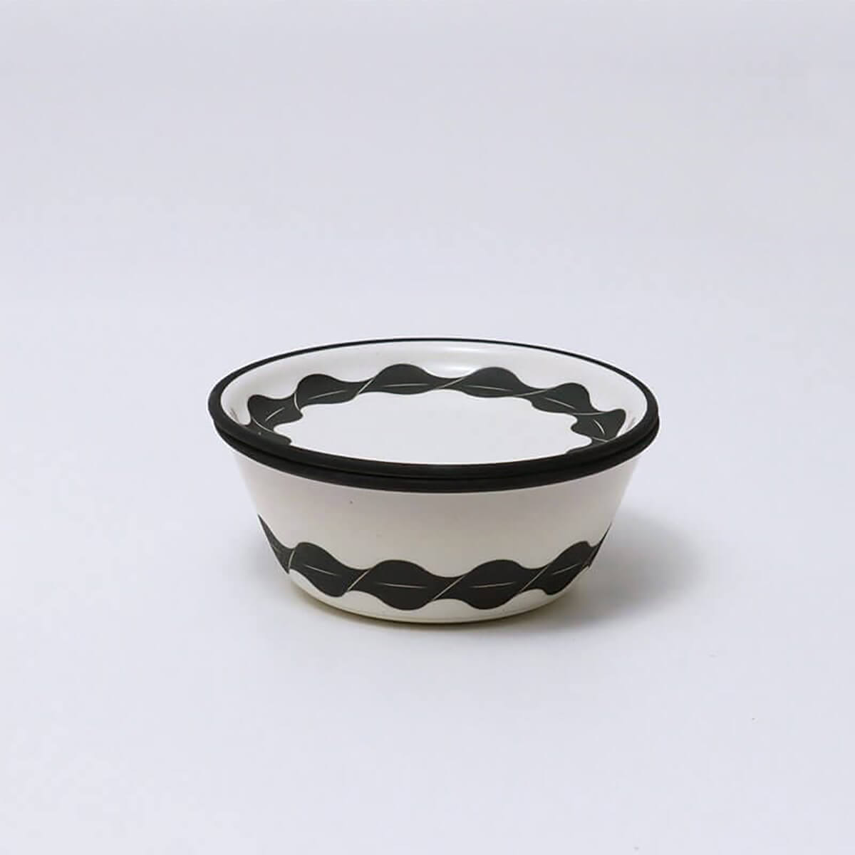 器の縁や胴部には、しめ縄やたが(箍)などかつて器を守るための梱包に用いられていた“しめる”道具に着想を得た、安田氏による黒一色の連続パターンが大胆に描かれています。そのグラフィックは、均整のとれた構造美と装飾性を併せ持ち、江戸後期の町人文化にみる機能を上回る強調した意匠性をグラフィックの視点で再解釈したものです。