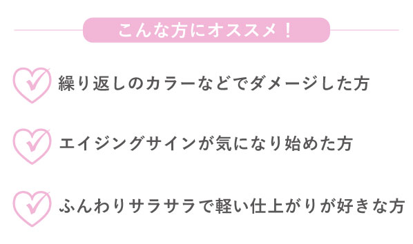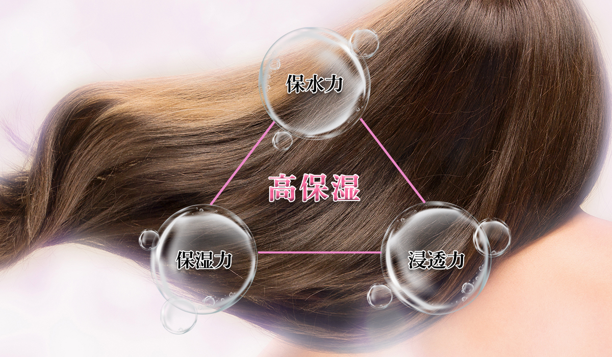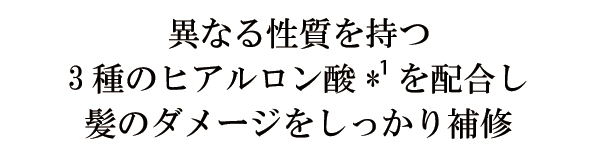 保水力のあるヒアルロン酸*2、保湿を持続させるヒアルロン酸*3、浸透力を高めるヒアルロン酸*4のアプローチで、髪にうるおいを与え、傷んだ髪をしなやかに整えます。