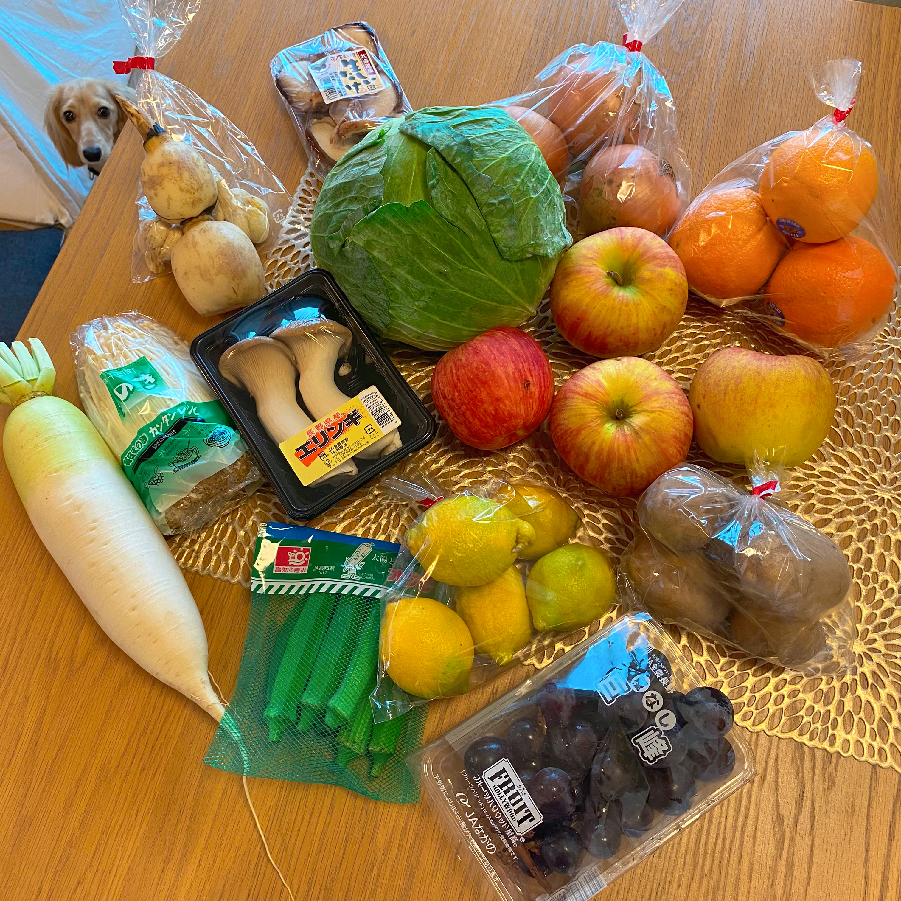 本当に色々入っていて、フルーツは、巨峰、レモン、オレンジ、りんごなど。野菜はきのこ類、キャベツ、大根、ニンニク、蓮根、おくらなどなど。野菜は重いものもあったので、買いに行くより家に届いて料理できて快適でした。