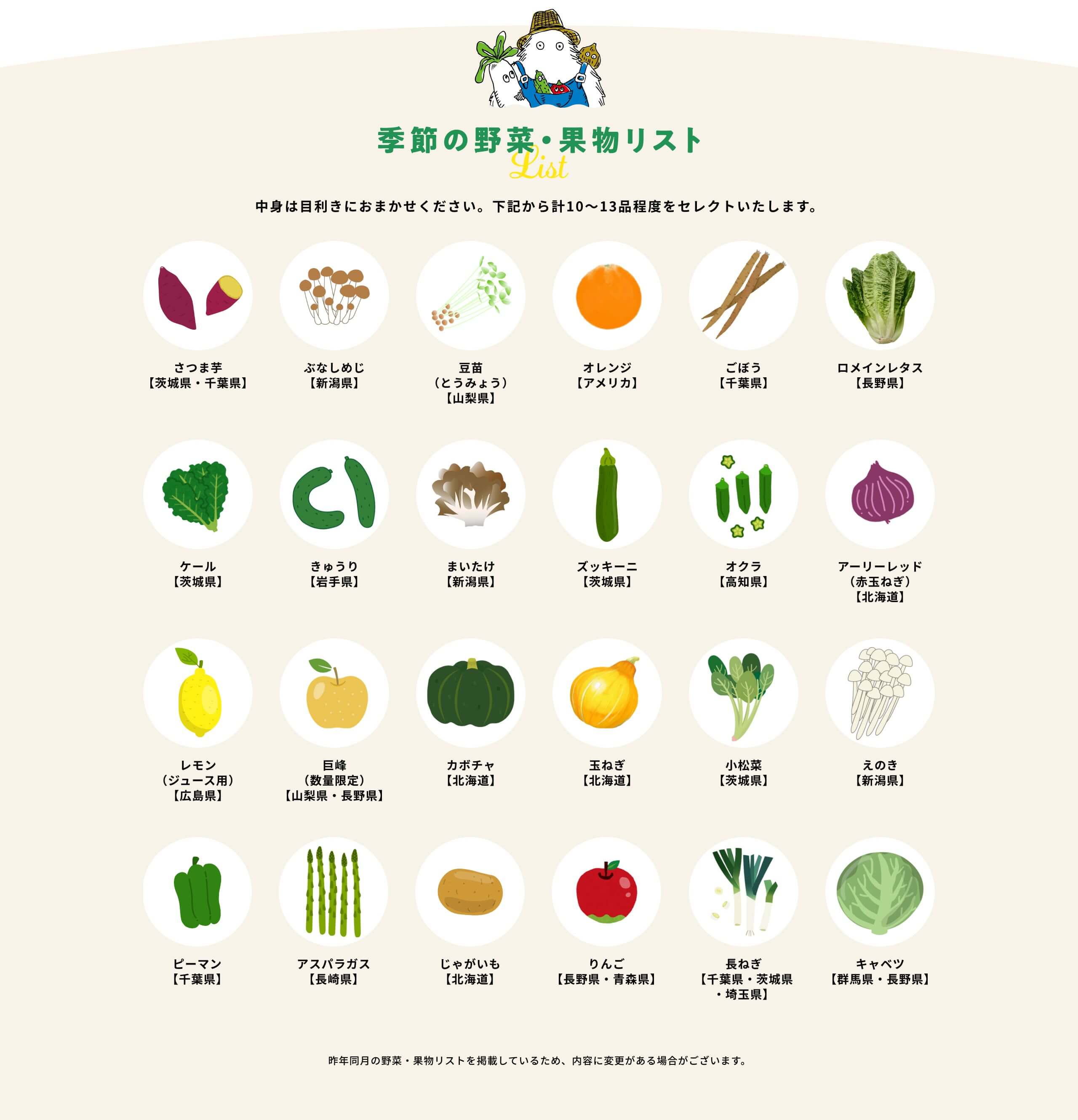 | 内容量 | 野菜4~6品 果物 3~4品 程度 |