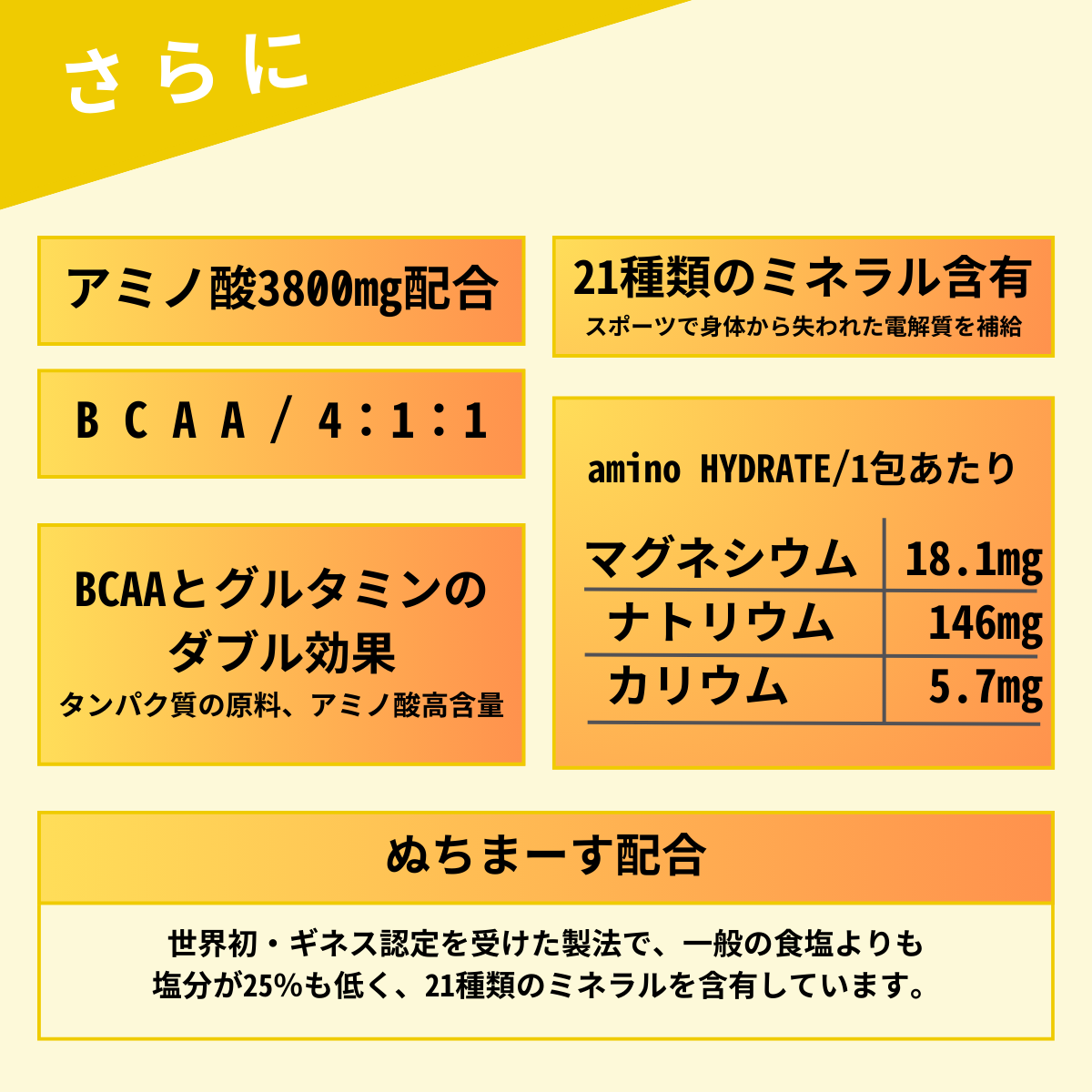 | 原材料名 | 還元麦芽糖水飴(国内製造)、食塩(ぬちまーす)、クレアチンモノハイドレート、レモンパウダー、黒胡椒抽出物L-ロイシン、L-グルタミン、クエン酸、L-バリン、L-イソロイシン、香料(山椒由来)、甘味料(酵素処理ステビア)、V.C、抽出V.E、ナイアシン、パントテン酸Ca、V.B1、V.B6、V.B2、V.A、葉酸、V.D、V.B12 |
