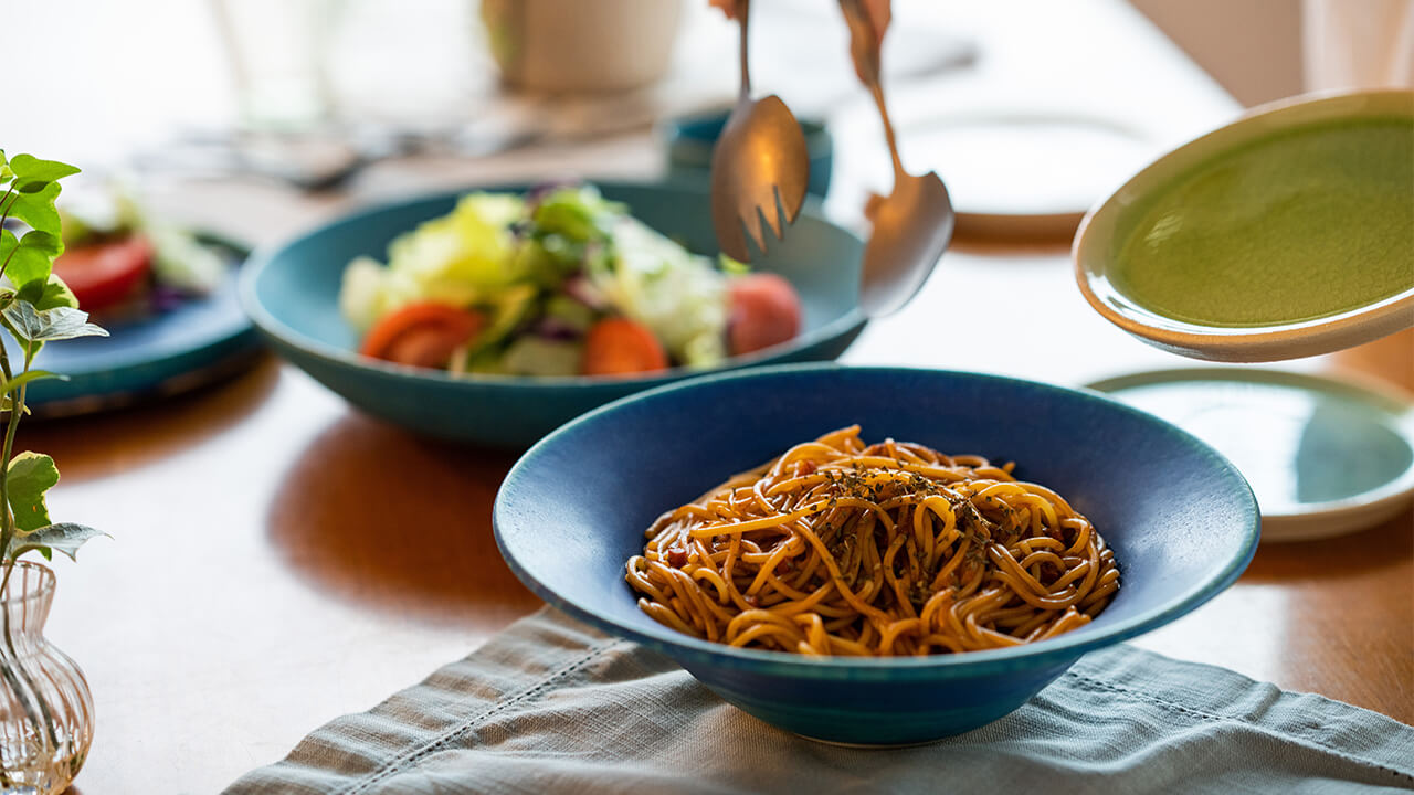 すごく鮮やかな器でパスタやサラダに