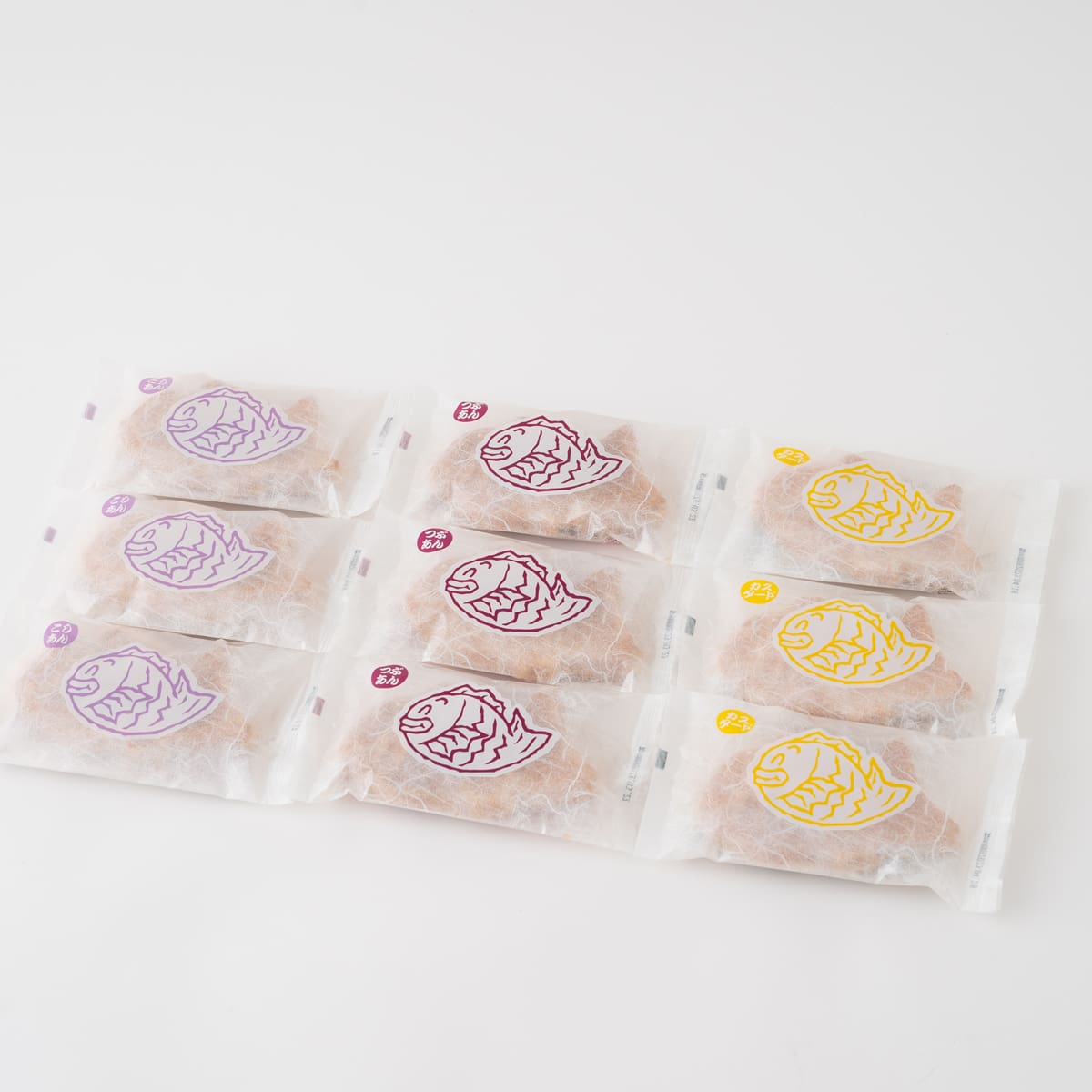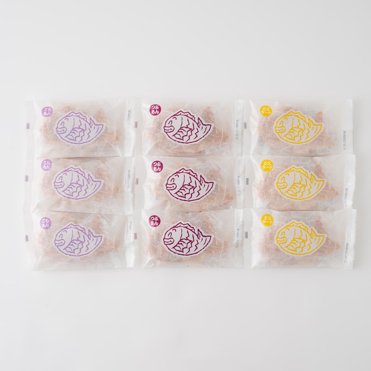 | 内容量 | 粒あんたい焼き 85g、こしあんたい焼き 85g、カスタードたい焼き80g ×各3 |