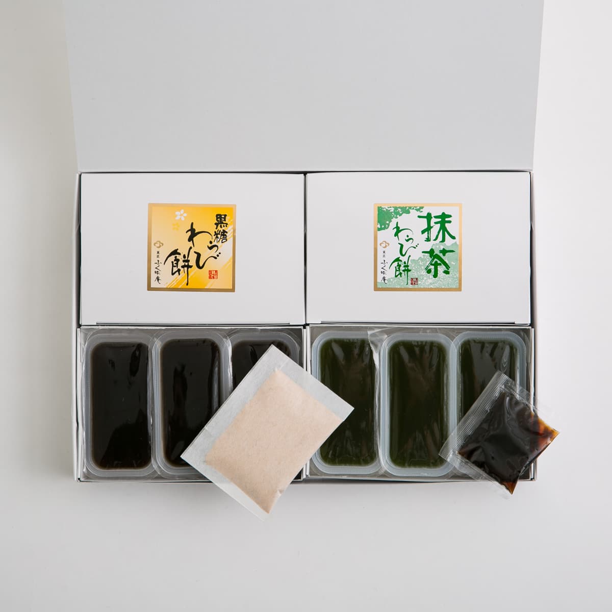 | 内容量 | 【抹茶わらびもち(60g×3)、黒蜜10g】×2箱、【黒糖わらびもち(60g×3)、きな粉6g】×2箱 |