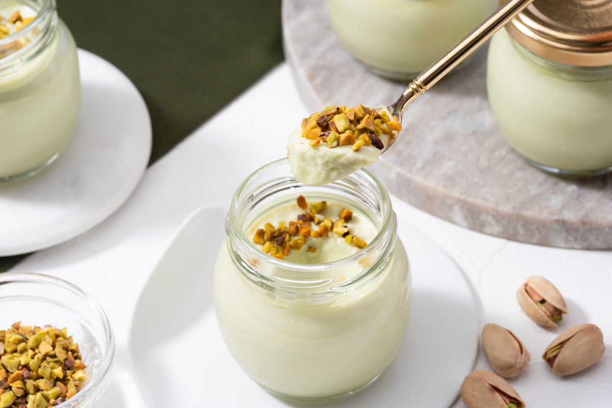 かけるピスタチオが新鮮でプリンとしては柔らかめ。